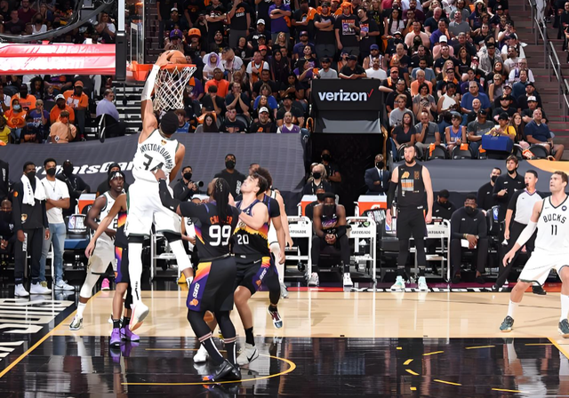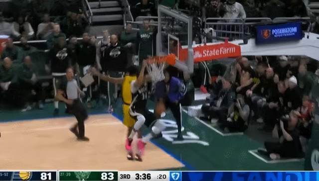 而最离谱的是,出现这种情况之后,字母哥并没有直接退场,在步行者快攻回合结束后,还留在前场的字母哥接队友传球,加速冲向篮筐又是一记暴力扣篮。